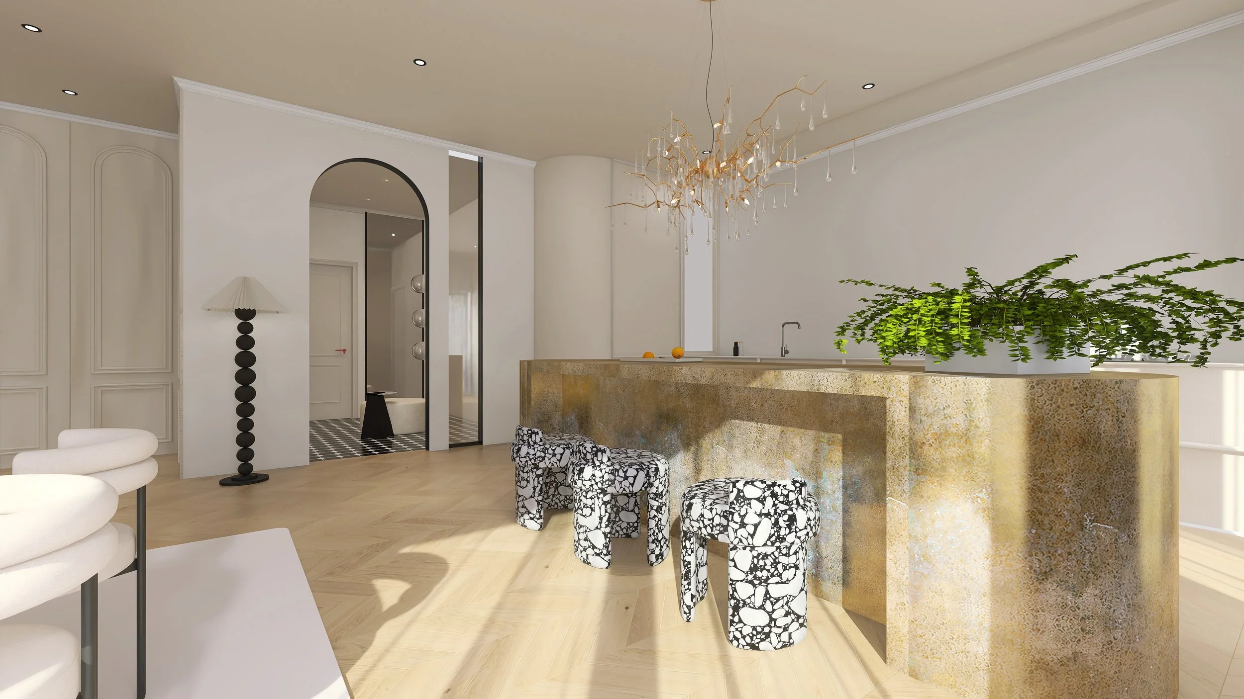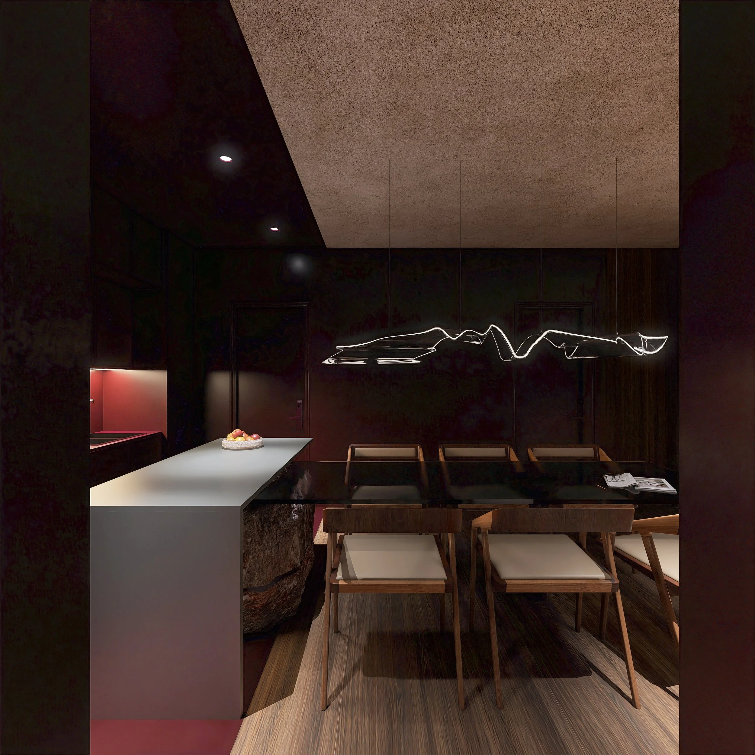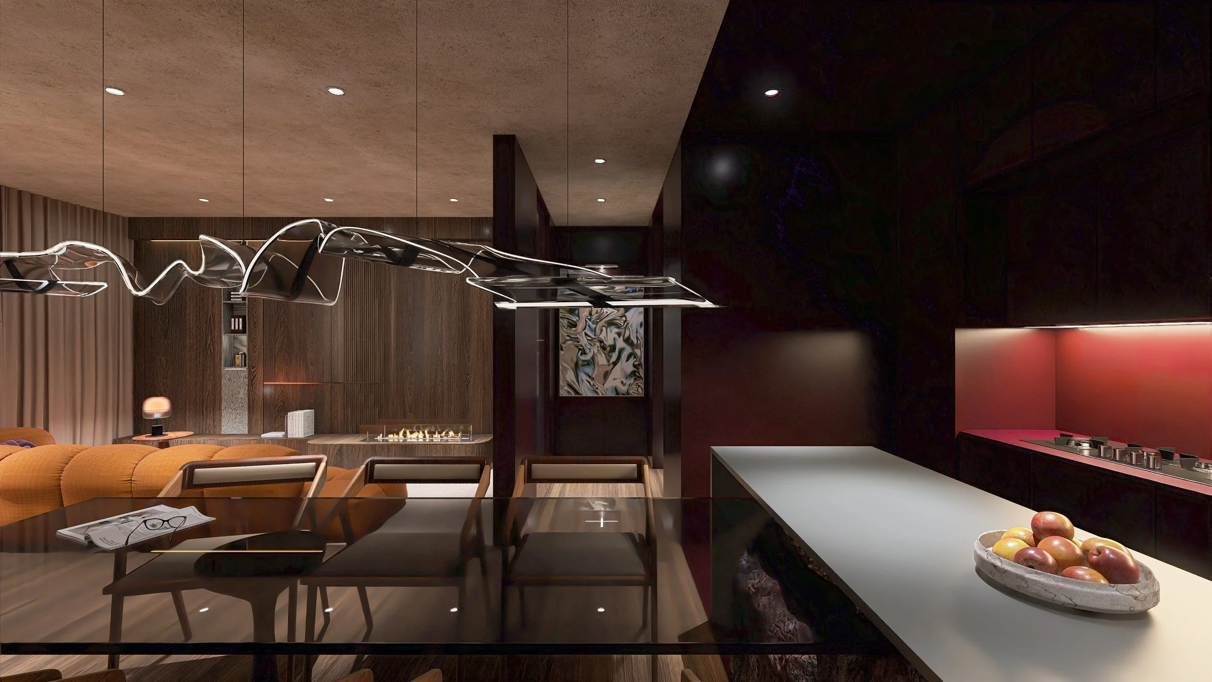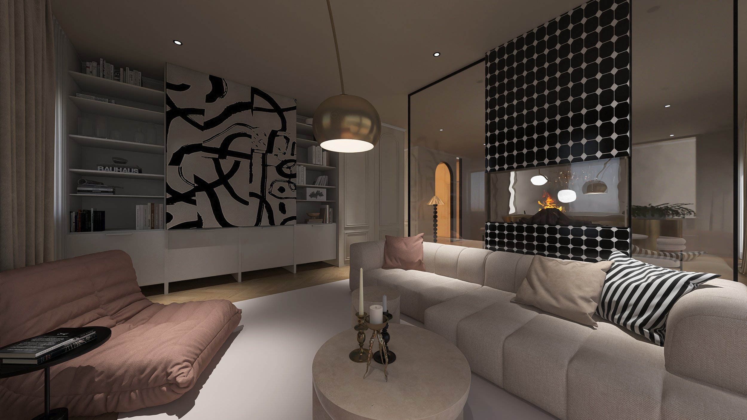 • Innenansicht eines Raumes mit marbled Wand- und Deckenflächen, dunkelbrauner Tür, modernem Wandlampen-Design und offenen Bücherregal, das mit warmem Licht beleuchtet ist.
